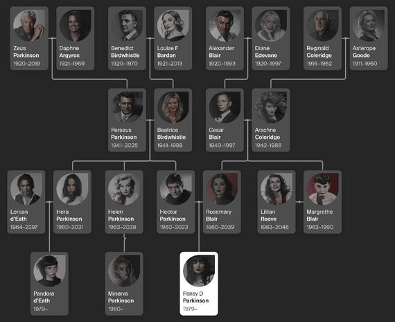 Dejando así a un único heredero válido a ojos de Zeus: Hector. Él fue listo y, cuando se vio atrapado en las garras de su compañera de casa en el colegio, decidió jamás dejarla ir. Así se casó con Rosemary Blair, y tuvieron una única hija: Pansy Discordia Parkinson.